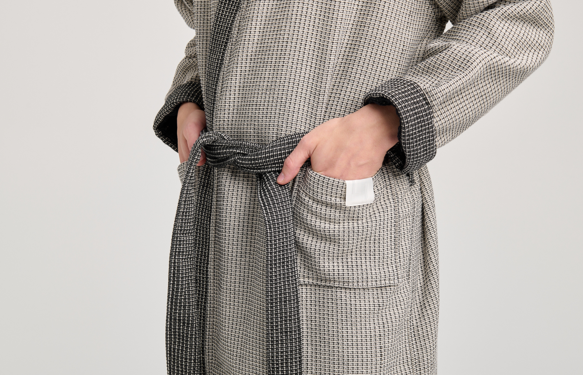 Für den Onsen-Bademantel haben wir ein eigenes Material entwickelt. Die Kombination aus Waffelstruktur und Schlingenstruktur sorgt für optimale Saugfähigkeit, weniger Verklumpen und ein angenehmes Tragegefühl. Die separate Färbung des Baumwollgarns, auch Garnfärbung genannt, erzeugt einen reizvollen Kontrast. Vorder- und Rückseite unterscheiden sich im Farbton, was die Einzigartigkeit des Bademantels unterstreicht. Dank des Unisex-Designs und der neutralen Farbkombinationen ist er der ideale Begleiter und ein perfektes Geschenk für jeden Anlass.